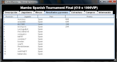 Nuestro compañero mas mix1980 volvio a entrar en premios en otro torneo en este caso la final de poker mambo en la que se alzo con la 3ª posicion , aunque con mala suerte ya que la jugada que le dejo fuera fue la siguiente erlolo666 sube y mix iguala con JQ de diamantes el flop trae 3Q3 , mix se resta por 7k mas o menos ya que ligo la Q y erlolo666 sin pensar paga con A4 picas pero el turn trae un 5 y el river un 2 que le dan escalera runner runner mala suerte o es ke realmente ese 666 es del diablo, de todas maneras buen torneo para nuestro compañero esperamos que a la proxima obtenga una mejor posicion