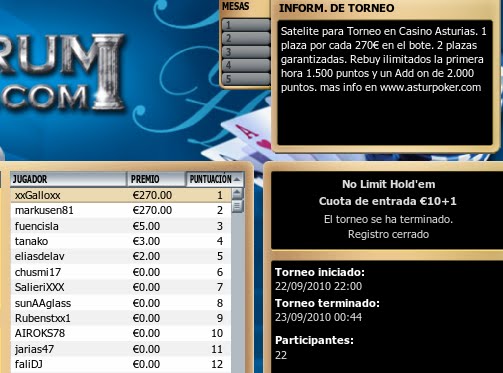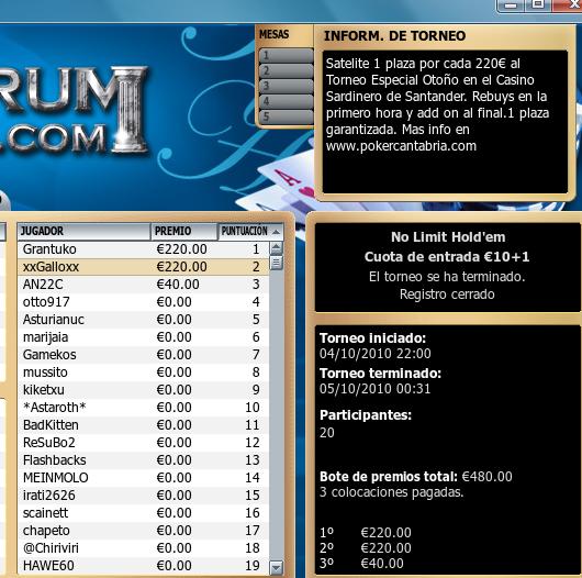 Comenzó la mesa final y a un ritmo muy lento fueron cayendo participantes hasta llegar a 4, con las ciegas en 10.000/20.000 decidieron pactar con 4.000€ para “DAFEGO” cheap-leader destacado en ese momento con más de un millón de puntos y 3.000€ para cada uno del resto de participantes. Aunque no dieron por finalizado el torneo, ya que repartían el resto que faltaba del bote, 1.100€ entre los dos primeros, después de este pacto el primero en caer fue curiosamente “DAFEGO” (Flamante Lider del Campeonato Ciudad de León 09/10), posteriormente “KONGI”, para llegar al final el Vallisoletano “PUTOLOBO” y el ganador del torneo “MAGAFU” que decidieron repartir los 1.100€ restantes pero con el honor de ganar el torneo para Manuel “MAGAFU”.