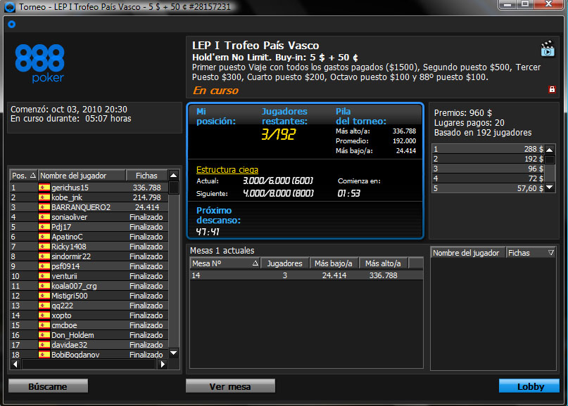 El torneo comenzó con puntualidad inglesa y en sus 3 primeros niveles se realizaron 50 rebuys y 75 add-on de 100€, que formaron un bote de 19.350€ descontando el 10% para el Ranking del Campeonato de Verano y en el que estaban en disputa más de 2 millones y medio de puntos en fichas.