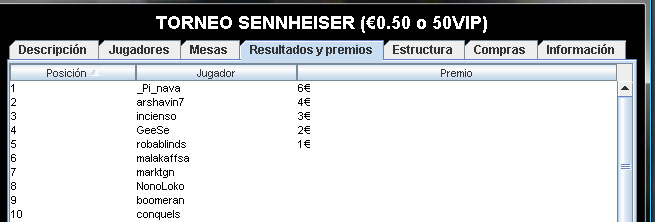 El resultado del torneo y sus premios originales fue el siguiente: