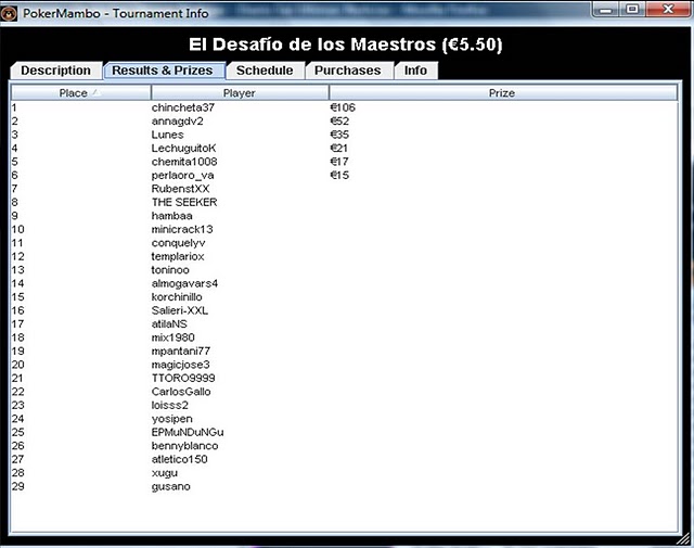 Despues de unas dos horas de torneo en el que dos miembros del equipo conquel y mix1980 lucharon por hacerse con la primera posicion el torneo lo gano pi_nava, con algun que otro batbeat en el momento justo termino llevandose el torneo un conocido con el que hemos compartido alguno que otro torneo incluso en vivo y con el que nuestro compañero mix a compartido muchas horas de poker desde sus comienzos.