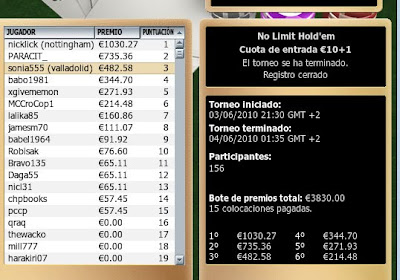 Nuestra amiga y compañera sonia555 se estrena en el blog con una 3ª posicion en un torneo de €2000 3 Max Rebuy, y sin hacer un solo rebuy , despues de llegar a la mesa final con bastantes fichas la mesa no era muy agresiva y se iban eliminando jugadores , mientras que Sonia555 conservaba su stack teniendo siempre mas de 50k fichas y llegando a superar las 100k , desplegando un gran juego y tranquilo, los jugadores iban cayendo hasta quedar 3 jugadores ,en este momento es cuando llego su eliminacion en una manao en la que ella sube, el chip-leader raisea y ella decide mover un all in, el cual es visto por nicklick , ella muestra KQ y el chip tiene 77 , las cartas comunitarias no acompañaron y el river trajo un 7 ke ledaba full a nicklick (dos manos antes babo1981 era eliminado con KK vs 77 de nicklick ke tambien pinchaba su trucha de 7)