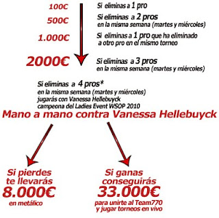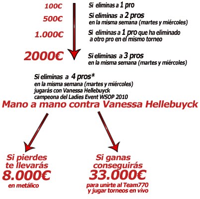Cada semana, reta a los pros del Team770 por solo 1,50€ y gana más y más:300 €, 500€, 1.000€, 2.000€… ¡hasta 33,000€ si consigues vencer a Vanessa Hellebuyck, campeona del Ladies Event WOPS 2010, en un mano a mano! Y si no puedes con ella, no te preocupes, porque te llevarás 8.000€ en metálico.