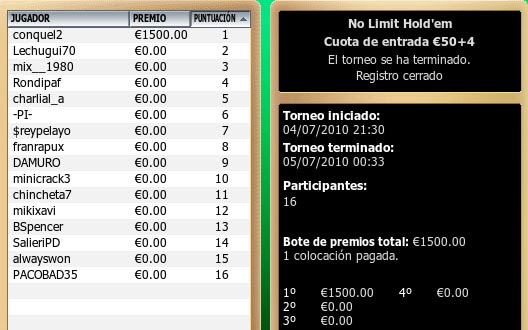 Siendo la unica mujer que particiba en el torneo nuestra compañera estuvo por momentos muerta pero ya sabeis como es de caprichoso esto del poker y al final remonto la partida llegando al HU con lechugito el cual estaba 3 a 1 por encima pero las ciegas mu altas y pocas fichas y en una pocas manos la partida se dio la vuelta y dio la victoria a nuestra compañera CONQUEL