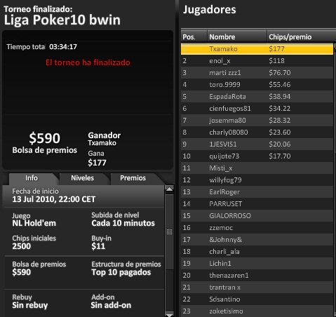 Nuestro compañero TTORO sigue sumando mesas finales y puntos en la liga bwin y se acerca mas a los premios, esperamos que consiga uno de los tan ansiados premios y a ver si por fin gana un torneo que se acerca cada vez mas pero se le resiste en los momentos finales