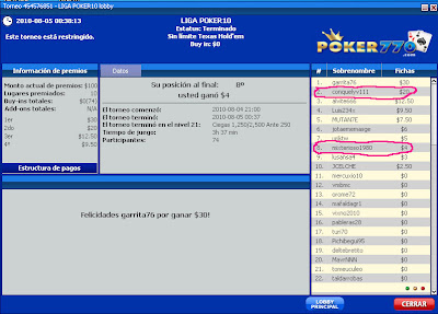 Nuestros dos compañeros consiguieron llegar a la mesa final de la liga poker10, conquel estuvo practicamente todo el torneo en primer lugar haciendo un grandisimo torneo como ya nos tiene acostumbrados ultimamente, mix quedo 8º tras envidarse con AK y perder contra KQ , mientras que conquel llego al HU contra garrita en el cual perdio su mano de 33 vs 107 en el board habia dos parejas superiores dando la mano a garrita con el 10 kicker llevandose asi el torneo, esperemos que algun dia esto sea al reves y empezar a alcanzar las primeras posiciones y que nuestras cartas aguanten para conseguir grandes resultados , de todas maneras gran torneo y a seguir asi ..