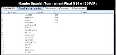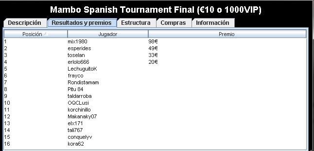 Nuestro compañero mix vuelve a pegar fuerte despues de un tiempo medio desaparecido que solo jugaba algo en vivo debido a tantos golpes que se estaba llevando a vuelto y parece que con buen pie , a ver si la racha sigue y esto es el pirncipio de algo , de momento aumento un poco mas su bank en Pokermambo llevandose la final mensual , por una vez las cartas se volvian de su lado y fue el quien daba los riverazos necesarios para culminar llevandose el torneo, decir que el torneo fue bastante interesante ya que cuenta con buenos jugadores