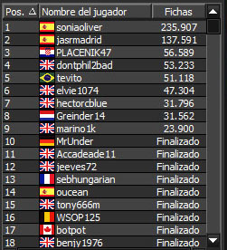 y ligando dobles en el turn el jugador britanico envido teniendo la suerte de pillar su A en el river para formar su trucha de A y hacerse con un bote bastante alto pero SONIA seguia primera y quedando ya tres jugadores fue ella la que con 88 elimino a elvie1074 la cual habia subido la mano y en un flop con dos treboles se envido y nuestra compañera acepto el all-in volviendo la jugadora britanica A6 de treboles pero que no ligarian nada mandandola al rail para formar el mano a mano final
