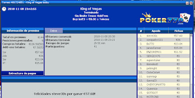 En el torneo de ayer de 888 el $10000 Monday Twins Challenge Flush con un buy in de 20$+2$, el cual pagaron 473 jugadores, nuestra compañera SONIA (soniaoliver) volvio a meterse en los puestos de cabeza esta ve siendo 4º y reportandola 700$ de premio, el torneo se prolongo duran mas de 6h que merecio la pena, parece que este soft se la da bastante bien y la esta reportando beneficios, con este son varios pinchazos ya en 888 y esperemos que siga la racha y poder verla en el puesto mas alto mas de una ve