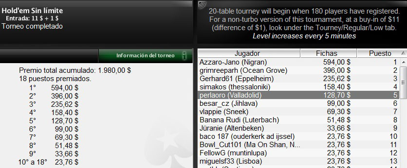 Nuestro compañero PERLAORO volvio a hacer otra caja mas en pokerstars esta vez fue en un torneo de 180 personas de 11$+1$, nuestro compañero obtuvo una meritoria 5ª posicion y cada vez se acerca mas hacia la esa primera posicion que estamos seguros de que conseguira muy pronto