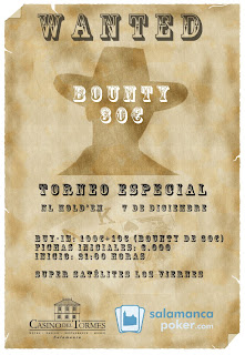 El próximo 7 de Diciembre se celebrará en el Casino del Tormes un Torneo Especial con uno de los formatos más divertidos, el torneo con bounty o recompensa.