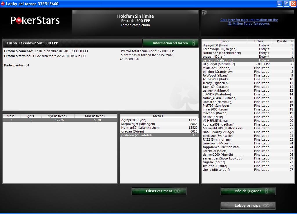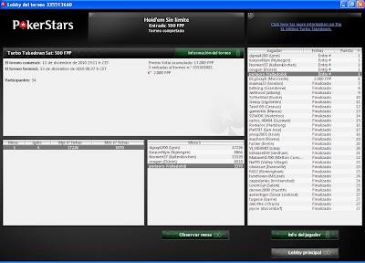 Nuestro compañero PERLA ayer despues de llegar del CEP en el que callo AQ vs 33 , en el cual se envido por 17500 puntos recibiendo un call de la ciega y no saliendo ninguna de sus cartas mandandolo al rail, por la noche disputo el satelite para el Turbo takedown de poker stars en el cual obtubo una plaza, este torneo tiene un garantizado de 1.000.000$, esperamos que la suerte le acompañe y pegue un pinchazito, mucha suerte y estaremos pendiente de el torneo