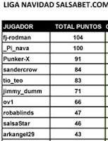 Nuestro compañero PI acaba de terminar 2º en la general de la liga de salsabet navidad que constaba de 10 torneos y se celebraba durante el mes de diciembre y en la que participaron 28 jugadores , solo 4 puntos le separaron de la primera posicion que se decidio en el ultimo torneo al solo poder quedar 2º ganandolo el jugador que al final se llevo la liga, su gran juego y su regularidad le acaban de reportar una Nintendo Wii, asi que a ver cuando se la mandan para poder estrenarla entre todos y montamos algo como siempre , eso si la baraja que no falte