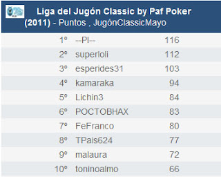 Nuestro compañero -PI- se lleva la liga le mes de mayo del Jugon Classic, podeis ver la entrevistra realizada por Poker10 en el siguente link
